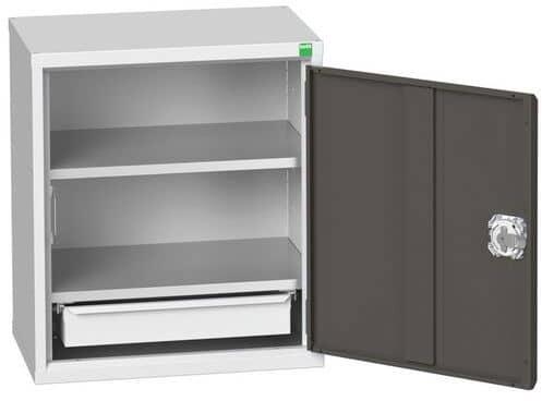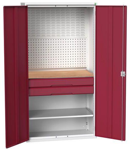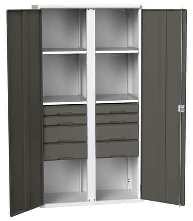 Fém műhelyszekrények hatékony használathoz üzemben és műhelyben. Hegesztett acélszerkezet, porszórt felületkezelés. Megerősített lengőajtók hárompontos hengerzárral, két kulccsal. Horganyzott polcok és fiókok 75 kg teherbírással, fiókok 100%-os meghosszabbítás a gördülőcsapágyakon. A hátsó fal perforált a szerszámtartók elhelyezéséhez és a műanyag dobozok fel