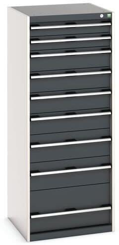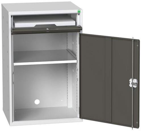 Bott Cubio fiókos szekrények horganyzott polccal, 100 kg teherbírással. Szekrényajtó perforált belső oldallal a szerszámok tárolására. Magas hegesztett acél konstrukció 1,5 tonna teherbírással, porszórt kivitelben. Zárás egy hengerzár két kulccsal.