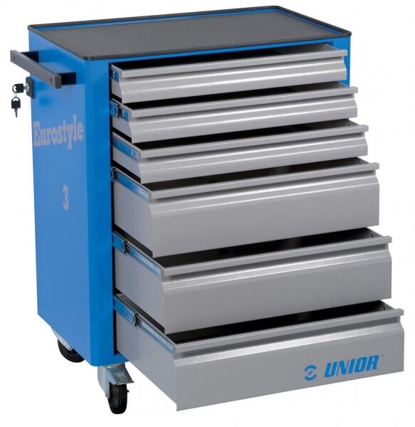 ›› Erős, acéllemez szerkezet, torziósan merev, nagy terhelésre tervezve ›› Munkaállvány ABS lappal ›› Az oldalak Euro-standard négyzetes perforációval tartozékokhoz ›› 6 fiók teleszkóposan teljesen kihúzható egyedi zárral (egykezes működés) ›› Az egyedi reteszelőszerkezet - csak a rejtett kioldórúddal oldható fel - megakadályozza a fiók nyitását a kocs