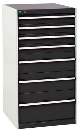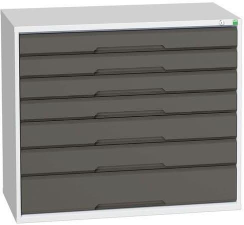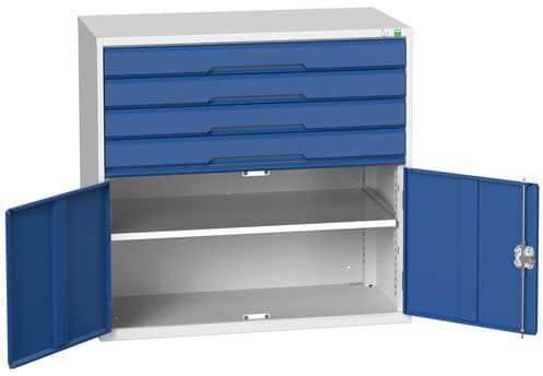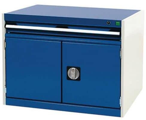 Bott Cubio fiókos szekrények 75 kg-os teherbírású és 100%-os görgőscsapágyakkal bővíthető fiókokkal. Szekrényajtó perforált belső oldallal a szerszámok tárolására. Magas hegesztett acél konstrukció akár 1,5 tonna teherbírással, porszórt bevonattal befejezni. Központi zárrendszerű zár és egyidejűleg több fiók nyitásának blokkolása. Ergonomikus fogantyúk írhat