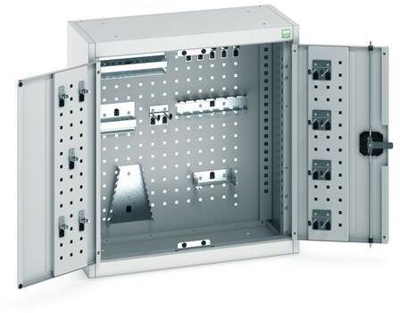 Függesztett fém szekrény perforációval és szerszámtartó készlettel. A szekrény hátulja és az ajtó belső része perforált panelekkel van felszerelve a szerszámtartók rögzítésére (perfo típus). Robusztus hegesztett acél konstrukció legfeljebb teherbírással 1 tonnáig, felületkezelés porszórt bevonattal. csavarhúzó, 1 x fúrótartó, 1 x csavarkulcs tartó, 1 x fűrész