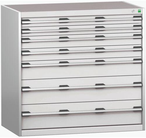 Bott Cubio fiókos szekrények 75 kg-os teherbírású, görgőscsapágyakon 100%-ban bővíthető fiókokkal. Magas hegesztett acélszerkezet, akár 1,5 tonna teherbírással, porszórt bevonattal. Központi zárrendszer és több nyitás blokkolása fiókok egyszerre. Ergonomikus fogantyúk feliratos szalaggal, zárás hengerzárral két kulccsal.