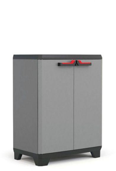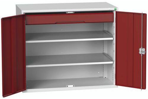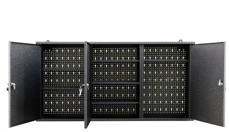 Fém műhelyszekrények polcokkal 100 kg teherbírással. Megerősített szárnyas ajtók perforált belső oldallal a szerszámok tárolására. Magas hegesztett acélszerkezet 1,5 tonna teherbírással, porszórt felülettel. Zárás központi zárral hengerzár két kulccsal. . 25 mm-es lépésekben állítható magasságú horganyzott polcok.