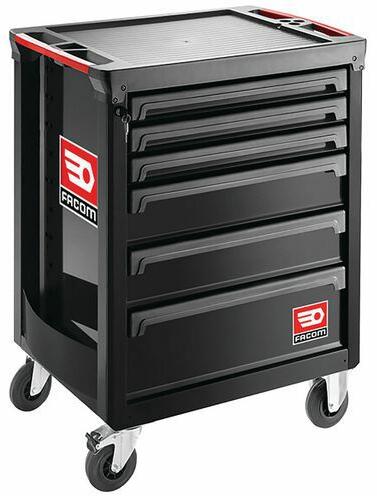 ROLL M3 6 fiókos szerszámos kocsi 800 kg statikus teherbírással. Üvegszálakkal megerősített polipropilén munkafelület a nagyobb ütésállóság érdekében. Két integrált fogantyú kettős anyagból készült puha borítással a kocsi könnyű mozgatásához és akadályokon átemelve. A polipropilén elülső fiókokat biztonsági kampókkal tartva nem áll fenn a kinyílás veszély
