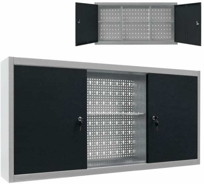 Szürke és fekete ipari stílusú fém fali szerszámos szekrény Ez a falra szerelhető szerszámos szekrény ideális szerszámai tárolásához, de vagány, ipari stílusának köszönhetően akár egyedi dekoratív kiegészítője is lehet otthonának. A szerszámtárolóban három állítható magasságú polc van, illetve egy perforált lemez eurolyukakkal, amelyekre különféle szerszámo