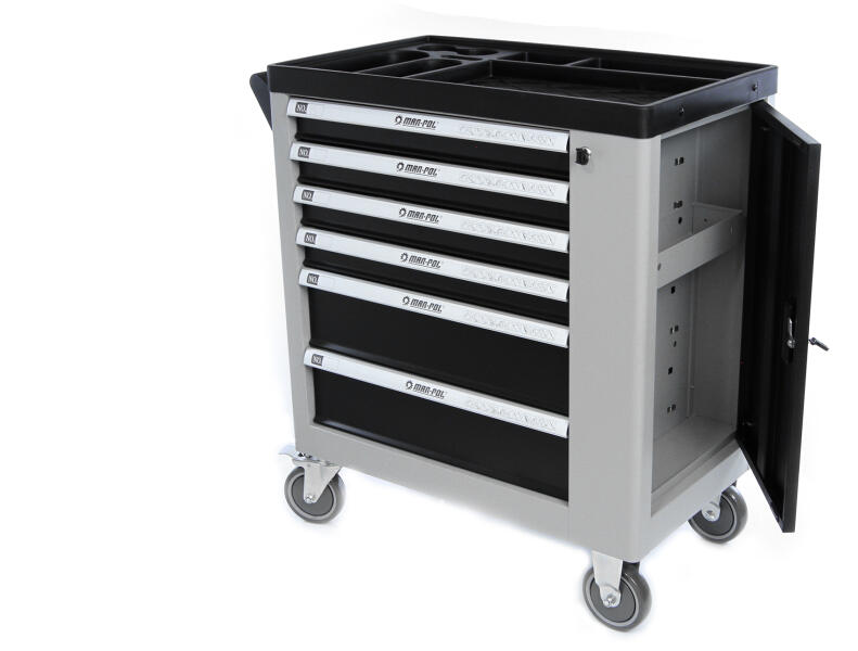Acél konstrukció beépített tároló rendszerrel A kocsi 4 kerekéből kettő forgatható és fékezhető, kettő fix Osztott rekeszes műanyag tálca a kocsi tetején és 3 mm vastagságú gumi csúszásmentes felület Oldalán található egy műanyag csavarhúzó tartó konzol és egy tároló rekesz Mágneses tálca a munkafelületen Alsó fiókban elektromos gépek tárolására is van leh