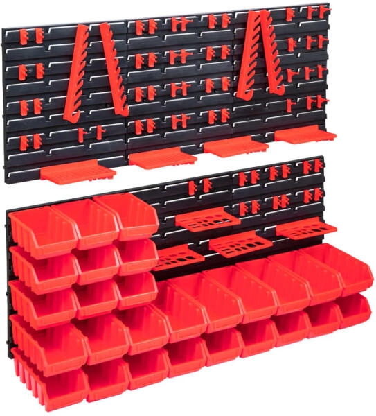 Tartson rendet garázsában, műhelyében vagy alkotóműhelyében ezzel a falra erősíthető tárolókészlettel. A rakásolható dobozokkal rendelkező praktikus állvány számos tárolási lehetőséget kínál apró tárgyak, például csavarok, szögek, anyák, aljzatok, szerelvények stb. számára. A 6 tömör fali panelen különböző rögzítő tartozékok és 27 doboz helyezhető el,