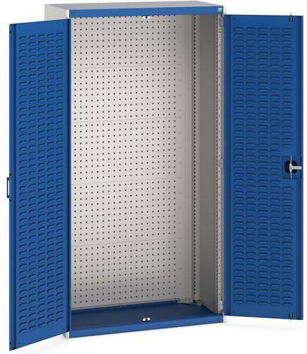 Fém műhelyszekrények polcokkal 100 kg teherbírással. Megerősített szárnyas ajtók perforált belső oldallal a szerszámok tárolására. Magas hegesztett acélszerkezet 1,5 tonna teherbírással, porszórt felülettel. Zárás központi zárral hengerzár két kulccsal. . 25 mm-es lépésekben állítható magasságú horganyzott polcok.