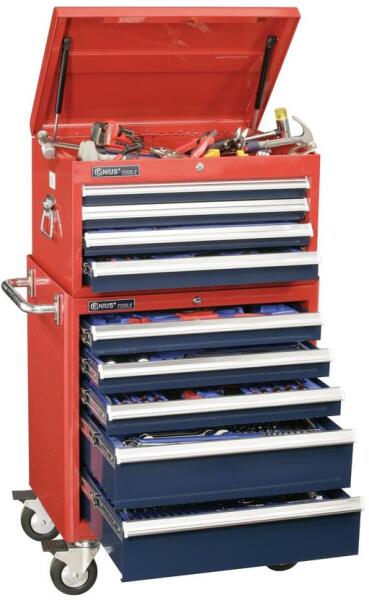 Komplett mester készlet 399db szerszámmal, 1db szerszámos szekrénnyel és 1db szerszámos ládával. A készlet tartalmaz egy kerekes szerszámos szekrényt 5 fiókkal, és egy szerszámos ládát 4 fiókkal+1 tároló rekesszel. A két termék külön-külön is használható, vagy egymásra téve egy komplett szekrényt alkot. Szerszámos láda:A felső tároló teleszkópos. 1 nagy és 3 ki
