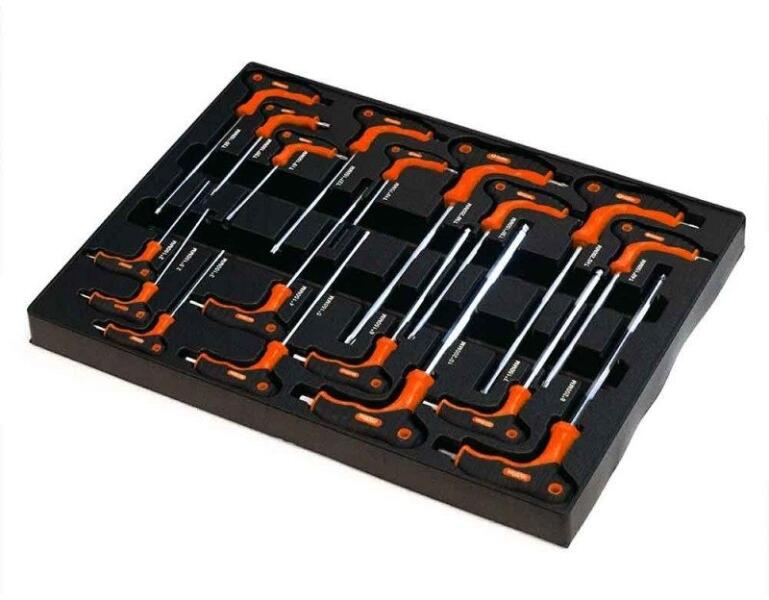 Ismertetés T-nyelű csavarhúzó készlet tálcában az LN-12399B szerszámos szekrényhez Tartalom 9db Torx csavarhúzó (T10x75, T15x100, T20x100, T25x150, T27x150, T30x150, T40x150, T45x200, T50x200) 9db gömbfejű imbusz kulcs (2x100, 2.5x100, 3x100, 4x150, 5x150, 6x150, 7x150, 8x200, 10x200)