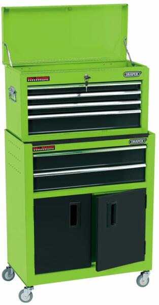 Színe: zöld Anyaga: acéllemez porszórt bevonattal Teljes mérete: 61,6 x 33 x 99,8 cm (Szé x Mé x Ma) Felső doboz mérete: 51,1 x 22,5 x 8,4 cm (Szé x Mé x Ma) Felső fiókok mérete: 51,1 x 22,5 x 4 cm (Szé x Mé x Ma) Alsó fiókok mérete: 51,1 x 30,8 x 8,4 cm (Szé x Mé x Ma) 6 fiókos görgős szekrény és szerszámosláda Felsõ szekrény fém fogantyúk Központi zárrendszer 2