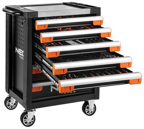A NEO 84-220+G szerszámos szekrény - 174 darab - méretei 810x465x825 mm (kerekekkel 980 mm). Kiváló minőségű SPCC acélból készül. 7 fiókkal rendelkezik (100%-os kihúzással), amelyek golyóscsapágyazott rendszeren alapulnak. A fiókok zárral és a tartalmuk feliratozására szolgáló helyiséggel rendelkeznek. A készlet 14 darab öntapadós cetlit tartalmaz, amelyekkel felcímké