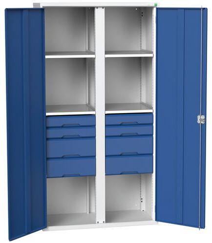 Fém szekrények speciális üzemeltetési célokra - típustól függően, polcokkal, fiókokkal, központi válaszfallal vagy akár akasztórúddal felszerelve. Horganyzott polcok 75 kg teherbírással, 25 mm-es lépésekben állítható magassággal. Fiókok 75 kg teherbírás és 100%-os kinyúlás gördülőcsapágyakon. Hegesztett acélszerkezet, porszórt bevonat. Megerősített szárnyas a