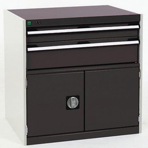 Bott Cubio fiókos szekrények 75 kg-os teherbírású és 100%-os görgőscsapágyakkal bővíthető fiókokkal. Szekrényajtó perforált belső oldallal a szerszámok tárolására. Magas hegesztett acél konstrukció akár 1,5 tonna teherbírással, porszórt bevonattal befejezni. Központi zárrendszerű zár és egyidejűleg több fiók nyitásának blokkolása. Ergonomikus fogantyúk írhat