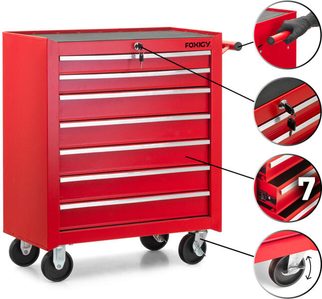 Szervezze meg műhelyét, és mindent egy helyen talál, amire szüksége van A műhelykocsi kiváló megoldás a szerszámok és alkatrészek praktikus tárolására . Nem hiányozhat egyetlen professzionális műhelyből, garázsból és gumiszervizből sem . A kocsi hét fiókkal van felszerelve , így elegendő tárolóhelyet biztosít. A tetején egy központi zár található, amellyel az ö