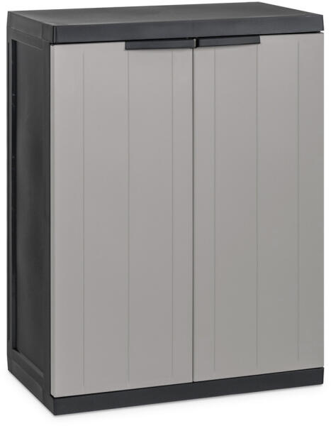Praktikus, műanyag kétszárnyú szekrény a BIOS MIDI LOW a szürke és fekete színkombinációban. TARTÓS ÚJRAHASZNOSÍTOTT ANYAG A BIOS MIDI LOW szekrény kiváló minőségű újrahasznosított anyagból készült, amely nem csak a hosszú élettartamot garantálja, hanem támogatja a fenntarthatóság és a környezetvédelem iránti elkötelezettségünket is. KÖNNYŰ ÖSSZESZERELÉS A