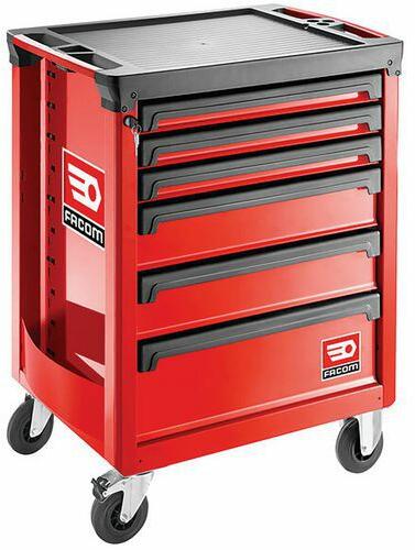 ROLL M3 6 fiókos szerszámos kocsi 800 kg statikus teherbírással. Üvegszálakkal megerősített polipropilén munkafelület a nagyobb ütésállóság érdekében. Két integrált fogantyú kettős anyagból készült puha borítással a kocsi könnyű mozgatásához és akadályokon átemelve. A polipropilén elülső fiókokat biztonsági kampókkal tartva nem áll fenn a kinyílás veszély