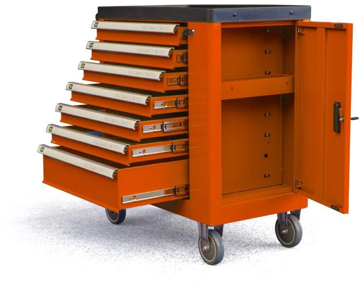 6 fiókos szerszámkocsi A C24S szerszámkocsi evolúciója! Megerősített munkalap és számos praktikus kiegészítő 249 db habszivacs tálcába rendezett szerszámmal felszerelve Fő jellemzők: 6 teljesen kivehető, teleszkópos, csapágyazott fiók, 588x367 mm: 4 fiók, 70 mm magas 1 fiók, 140 mm magas 1 fiók, 280 mm magas Univerzális munkalap legurulásgátló peremmel és nyolc csavarh