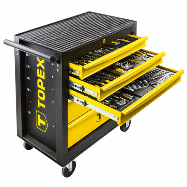 Termékleírás Topex műhelykocsi, 455 el. (Ref. sz. 79R502) mérete 680 x 460 x 825 mm. A szekrény 5 praktikus szerszámtartó fiókot tartalmaz, melyek központi zárral zárhatók. A fiókok teljesen kinyithatóak, vezető görgőn mozognak, amelyek biztosítják a hosszú élettartamot és a folymatos és üzembiztos működést. A munkapolc felület gumi burkolattal van ellátva, mely ellen