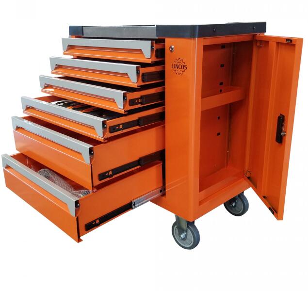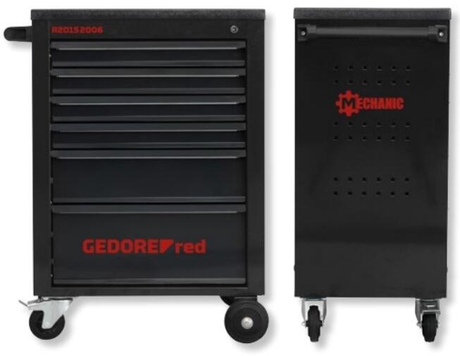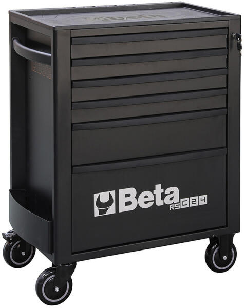 MECHANIC műhelykocsi 6 fiókkal matt-fekete Méret: 910x628x418 Fiókok: 4 x 69 mm magas 1 x 144 mm magas 1 x 218 mm magas A szerszámok és felszerelések biztos, áttekinthető és mobil tárolására Stabil acéllemezkonstrukció ABS-műanyagból készült lerakó felülettel Bőséges hely 6 fiókban, egyenként 25 kg terhelhetőséggel, a kocsi összterhelhetősége 210 kg Négy fiók a szer