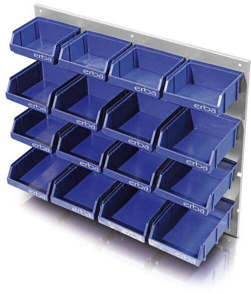 ERBA 16 rekeszes fali szortimenter, tároló készlet. Kiválóan alkalmas könnyű apró alakatrészek tárolására. Hátlap mérete: 558x458x10mm. Tároló dobozok méretei: 8 x 140x125x60mm rekesz. 4 x 174x125x60mm rekesz. 4 x 110x125x56mm rekesz. 1 x fém hátlap.