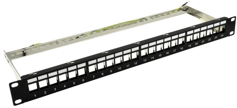 19"; keystone patch panel; 24 port; cat5e/cat6/cat6a kompatibilis; árnyékolt; tehermentesítővel keystone modul nem tartozék Rack magasság: 1 U Szélesség: 19"; Kategória: Keystone Árnyékolás: van Szín: fekete Adatlap