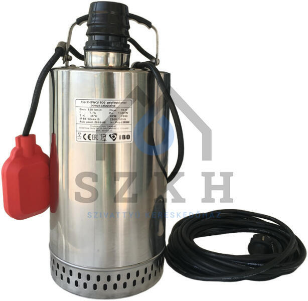 Professzionális búvárszivattyú szennyezett víz és egyéb víztelenítéshez. Használhatók kommunális üzemeknél és családi házaknál. , Csőcsatlakozása: 65 mm, Emelő magasság: 10 m, Szállítási teljesítmény: 830 l/perc, Teljesítmény: (230V) 1500 W, Max szennyeződés átmérője: 5 mm, Szivattyú magassága: 430 mm, Szivattyú átmérője: 170 mm, Kábel: 10 m, Súlya: 15 kg