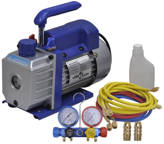 vidaXL egyfokozatú vákuumszivattyú 4-irányú elosztómérő készlettel Ez a komplett hűtőgépszerelő szerszámkészlet vákuumszivattyút és négyirányú elosztómérő készletet tartalmaz. Ezt a vákuumszivattyút professzionális használatra tervezték hűtő- és légkondicionáló rendszerekhez. A szivattyú vákuumot képez, amely lehetővé teszi a légkondicionáló rendszer hű