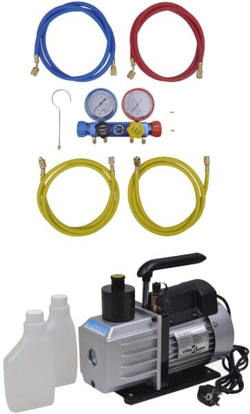 vidaXL vákuumszivattyú légkondicionálóhoz 4-irányú elosztómérő készlettel Ezt a vákuumszivattyút klímaberendezésekben való professzionális használatra tervezték. A szivattyú vákuumot hoz létre, amely lehetővé teszi a légkondicionáló rendszer későbbi feltöltését hűtőközeggel. A szivattyú alumínium burkolattal és praktikus olajszintmérő üveggel rendelkezik, a
