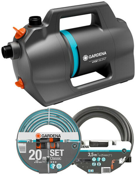 A GARDENA 4100 Silent kerti szivattyúja optimális bevezetést kínál a nagy teljesítményű, hatékony és energiatakarékos szivattyúk világába. A készlet tartalmazza a nagy teljesítményű 4100 Silent kerti szivattyút, egy 20 méter hosszú kerti tömlőt, egy 3,5 méter hosszú szívótömlőt szívószűrővel és visszafolyás-gátlóval, egy praktikus fecskendőt és egyéb GARDENA