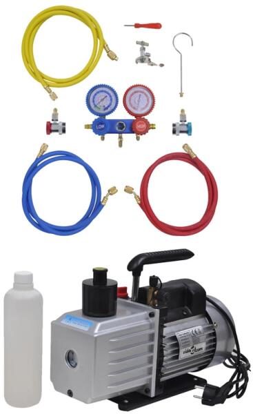vidaXL vákuumszivattyú 100 L/perc 2-irányú elosztómérőszettel Ezt a professzionális felhasználásra szánt vákuumszivattyút hűtő- és légkondicionáló rendszerek számára tervezték. A szivattyú vákuumot hoz létre, amely lehetővé teszi a légkondicionálórendszer későbbi feltöltését hűtőközeggel. Műszaki jellemzőinek köszönhetően a szivattyú alkalmas hűtőgépe
