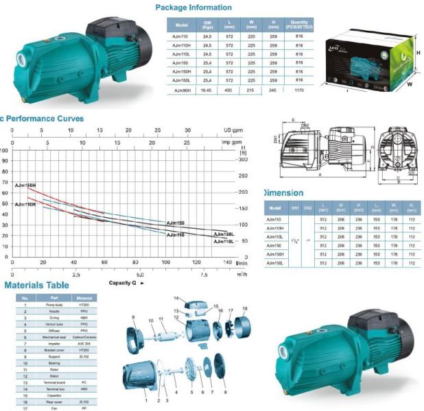 Az AJM 110L Jet szivattyú tiszta víz vagy ehhez hasonló kémiai tulajdonságú folyadék szállítására. Fő felhasználási területe: fúrott kutakból való vízkivétel, árasztásos vagy szórófejes öntözés, házi vízművekkel…