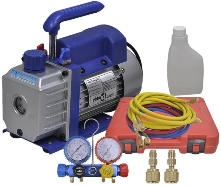 vidaXL egyfokozatú vákuumszivattyú 4-irányú elosztómérő készlettel Ez a komplett hűtőgépszerelő szerszámkészlet vákuumszivattyút és dupla elosztómérő készletet tartalmaz fröccsöntött tartótokban. Ezt a vákuumszivattyút professzionális használatra tervezték hűtő- és légkondicionáló rendszerekhez. A szivattyú vákuumot képez, amely lehetővé teszi a légkondic