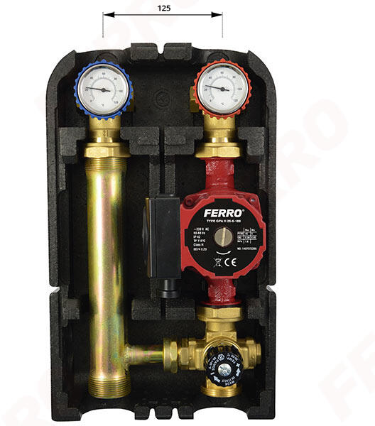GMPT60GPA FERRO Padlófűtés/mennyezetfűtés keverőegység Szivattyús keverőegység alacsony hőmérsékletű rendszerekhez Alacsony hőmérsékletű rendszerek pl a padlófűtés illetve a fal, valamint a mennyezetfűtés. Az előre összeszerelt, szivattyúval ellátott egység megkönnyíti a szerelést. A vízhőmérsékleteket a beépített hőmérőkön tudjuk leolvasni, ez megkönnyít