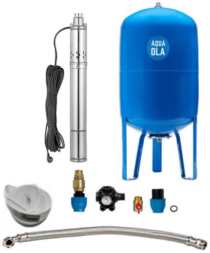 A SQOLA 0.55 rozsdamentes acél orsós szivattyúval ellátott vízmű AISI 304 rozsdamentes acélból készült szivattyúházzal, nyakkal, tengellyel és csavarokkal rendelkezik, 1"-os csatlakozású AQUA OLA 100l hidrofor tartály. Üzemi nyomás 10 bar. Házi vízmű orsóval 3" szivattyú SQOLA 0.55kW (230V) kiváló teljesítményt kínál alacsony áron. A szivattyú akár 68m-es kibocsát