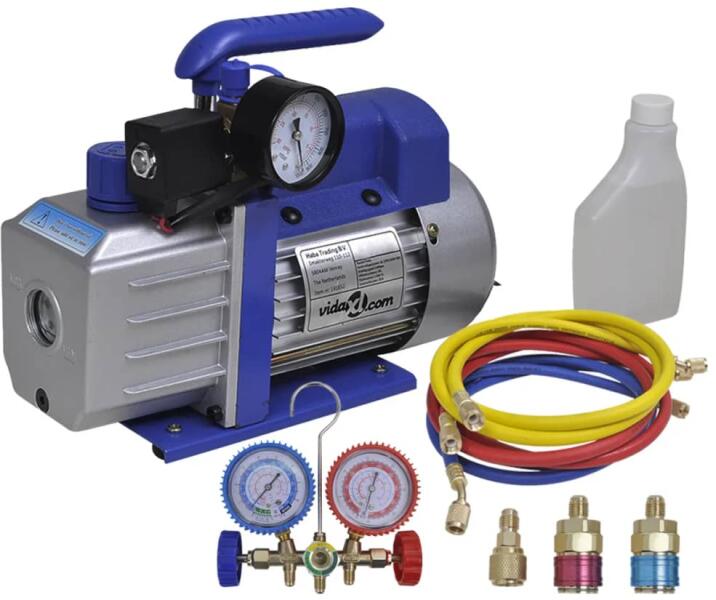 vidaXL egyfokozatú vákuumszivattyú dupla elosztómérő készlettel Ez a komplett hűtőgépszerelő szerszámkészlet manométeres vákuumszivattyút és dupla elosztómérő készletet tartalmaz. Ezt a vákuumszivattyút professzionális használatra tervezték hűtő- és légkondicionáló rendszerekhez. A szivattyú vákuumot képez, amely lehetővé teszi a légkondicionáló rendszer hű