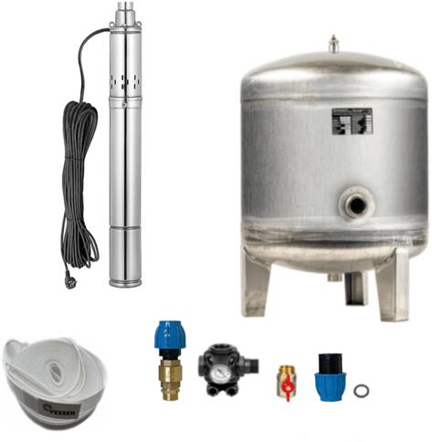 A SQOLA 0.75 rozsdamentes acél orsós szivattyús vízmű szivattyúházzal, nyakkal, tengelysel, rotorral és csavarokkal AISI 304 rozsdamentes acélból készült. CH 90L rozsdamentes hidrofor tartály 1" csatlakozással. Üzemi nyomás 5 bar. Házi vízmű orsóval 3" szivattyú SQOLA 0.75kW (230V) kiváló teljesítményt kínál alacsony áron. A szivattyú akár 112m-es kibocsátást és 32