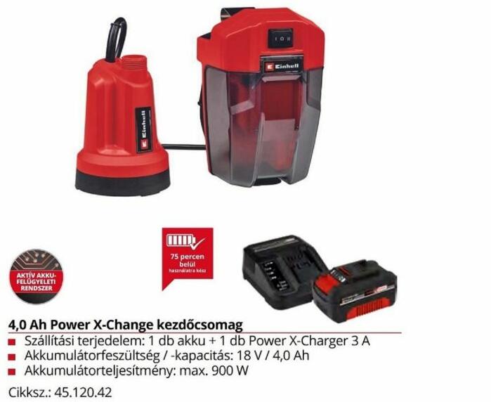 Einhell GE-SP 18 LL LI-KIT 4,0 Akkumulátoros merülÅ vÃzmentesÃtÅ szivattyú, zsompszivattyú tiszta vÃz szivattyúzására. Einhell GE-SP 18 LL LI-Kit 4,0 akkumulátorral és töltÅvel rendelkezÅ változat. Ideális azoknak akik még nem rendelkeznek Einhell termékekkel és még nincs akkumulátoruk és töltÅjük.  1 db 18V/4,0