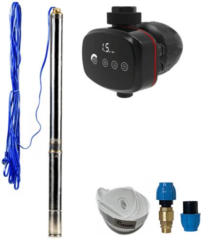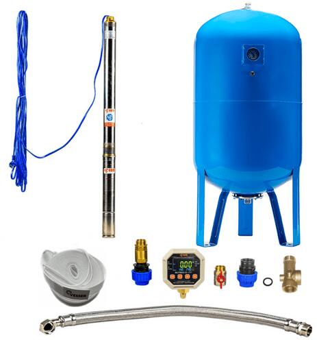 Házi vízmű búvárszivattyúval 3Ti-27 / 100l - RTS digitális nyomáskapcsolóval, ivóvíz és használati víz szivattyúzására szolgál. A használat: vízellátó rendszerek kialakítása családi házakban, nyaralókban, nyaralókban, iskolákban és mezőgazdasági létesítményekben kertek permetezésére és öntözésére friss/új kutakhoz és fúrásokhoz Előnyök: 8 m-nél nagy