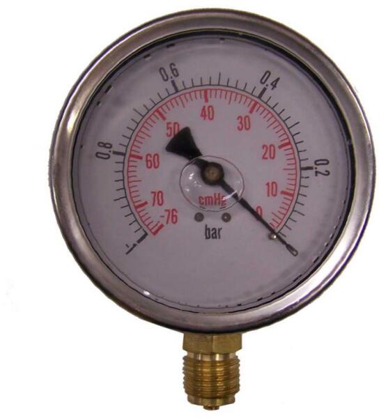 Méréstartomány: 0-1Bar (0-76 cmHg) Átmérõ: 100mm-4" Kivitel: Inox ház Csatlakozás: 1/2" külsõ menet Folyadékcsillapítású (glicerintöltésű) nyomásmérõ