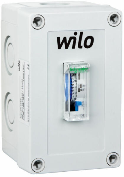 Falra szerelhető időkapcsoló készülék egy- vagy háromfázisú motoros Wilo egyes-szivattyúk automatikus, időfüggő be-/kikapcsoláshoz. Kapcsolási funkció: - Időfüggő automatikus be-/kikapcsolás 24 órás kapcsolóórával, beállítható időpontokban (1-órás lépésekben). - Több szivattyú párhuzamos kapcsolása lehetséges a maximális kapcsolási teljesítményig. Időkap