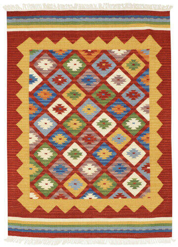 A Kelim classic egy klasszikus, azték mintájú szőnyeg, amely mind a klasszikus, mind a modern enteriőrt hangulatossá teszi. Szövőszéken kézzel szőtt szőnyeg a legjobb minőségű új-zélandi gyapjúból gyapjúfonaton. A szőnyeg halommagassága mindössze 2 milliméter, így padlófűtéses helyiségekbe is alkalmas. A szőnyeg két oldalán pamut rojtokkal van befejezve. A szőnyeg