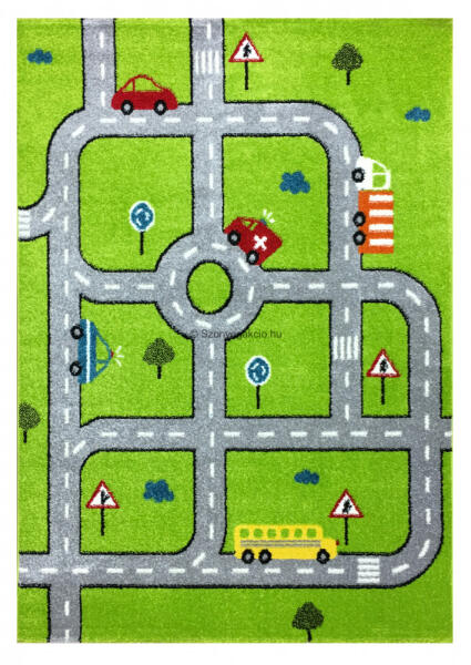 Színes, vidám közlekedés mintás szőnyeg zöld alapszínnel. Puha tapintású, kellemes érintésű szőnyeg, melyen a gyermekek szívesen játszanak. Száltípus: friese szőnyeg Súly: 2000 gr/nm Anyag: 100% polipropilén - Antiallergén - Padlófűtés esetén is használható - Könnyen kezelhető - Tartós szín Kereskedelmi forgalomban kapható általános szőnyegtisztító készítmé