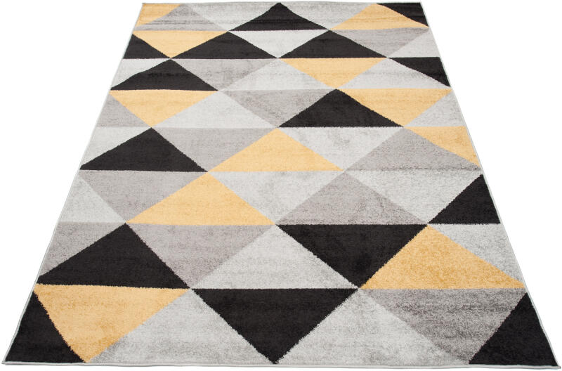 Fekete, szürke és sárga geometrikus mintával díszített modern szőnyeg a klasszikus és a modern otthonokba egyaránt. A designjának köszönhetően tökéletes nappali, hálószoba vagy gyerekszoba szőnyeg lehet. Az 1400 g/m2 sűrűségű és 8-9 milliméter hosszú szálakkal rendelkező színes szőnyeg gyönyörű geometrikus mintával díszített. A polipropilén szálak kiemelkedő p