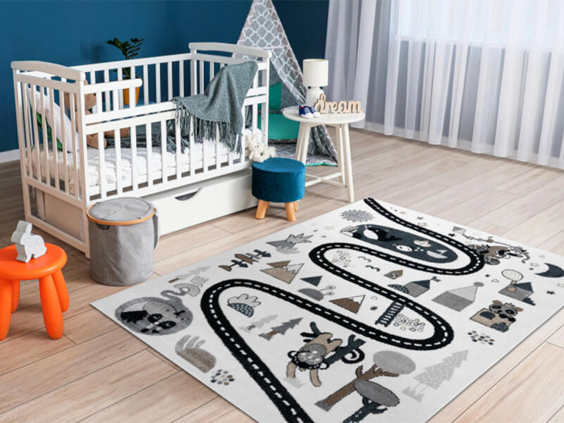 . Krémszínben készült aranyos állat mintás gyerekszőnyeg, amely egy erdőn keresztül vezető utat ábrázol. A praktikus közlekedés szőnyeg tökéletes választás minden gyerekszobába, főleg a fiús gyerekszobákba a kék színe miatt. Minőségi 100 % polipropilénből készült, amely megvédi a gyerekeket a hideg padlótől. 1800 g/m2 sűrűségű Soft Frisé típusú 8 mm magas s