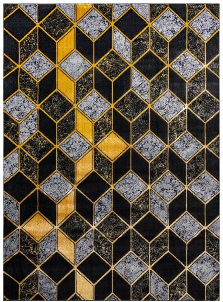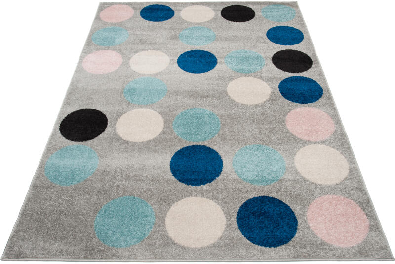 Fekete, szürke és kék pöttyös modern szőnyeg a klasszikus és a modern otthonokba egyaránt. A designjának köszönhetően tökéletes nappali, hálószoba vagy gyerekszoba szőnyeg lehet. Az 1400 g /m2 sűrűségű és 8-9 milliméter hosszú szálakkal rendelkező színes szőnyeg gyönyörű geometrikus mintával díszített. A polipropilén szálak kiemelkedő puhaságúak és rugalmass