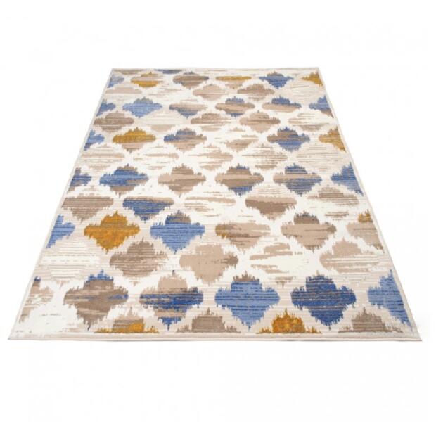 Bézs színű ROLO szőnyeg barna, sárga és kék színű mintával. A 11 milliméter hosszú szálakkal rendelkezik. A polipropilén (PP) szálak igazán puhák és rugalmasak. Ugyanolyan jól mutat egy modern nappaliban vagy hálószobában, mint a gyerekszobában. A rövid szálú szőnyeg nem deformálódik és magas ellenálló képességgel rendelkezik a mechanikai sérülésekkel szemben.