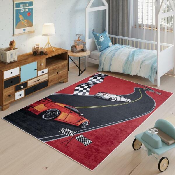 Versenypálya motívumú, gyerekszőnyeg, minőségi anyagból és a legújabb divattrendek szerint tervezve.