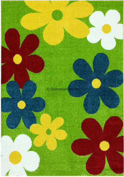 Színes, vidám virágos szőnyeg zöld alapszínnel. Puha tapintású, kellemes érintésű szőnyeg, melyen a gyermekek szívesen játszanak. Száltípus: friese szőnyeg Súly: 2000 gr/nm Anyag: 100% polipropilén - Antiallergén - Padlófűtés esetén is használható - Könnyen kezelhető - Tartós színAz alábbi méretekben vásárolható:Kereskedelmi forgalomban kapható általános szőn