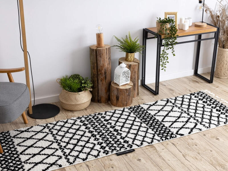 A BERTY hosszú futószőnyeg egy stílusos és praktikus kiegészítő minden otthonba. A fekete - fehér színének és a geometrikus mintának köszönhetően kellemes elegáns hatást kölcsönöz minden szobának. Ez a szőnyeg nem csak egy gyönyörű dekorációs elem, de egy megbízható és praktikus darab is, amely otthonát még kényelmesebbé és otthonosabbá varázsolja. A szőnyeg